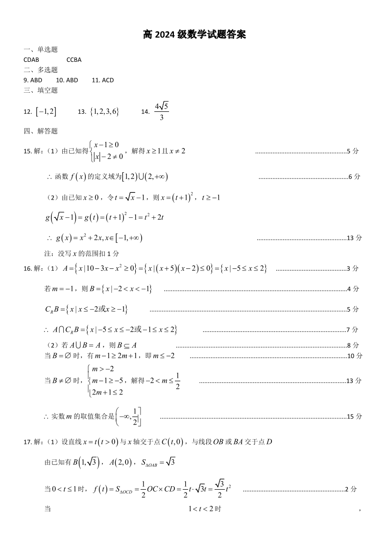 四川省南充高级中学2024-2025高一上学期期中考试 数学答案