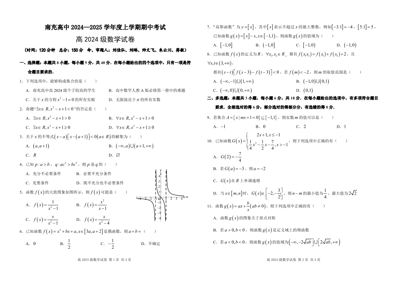 四川省南充高级中学2024-2025高一上学期期中考试 数学