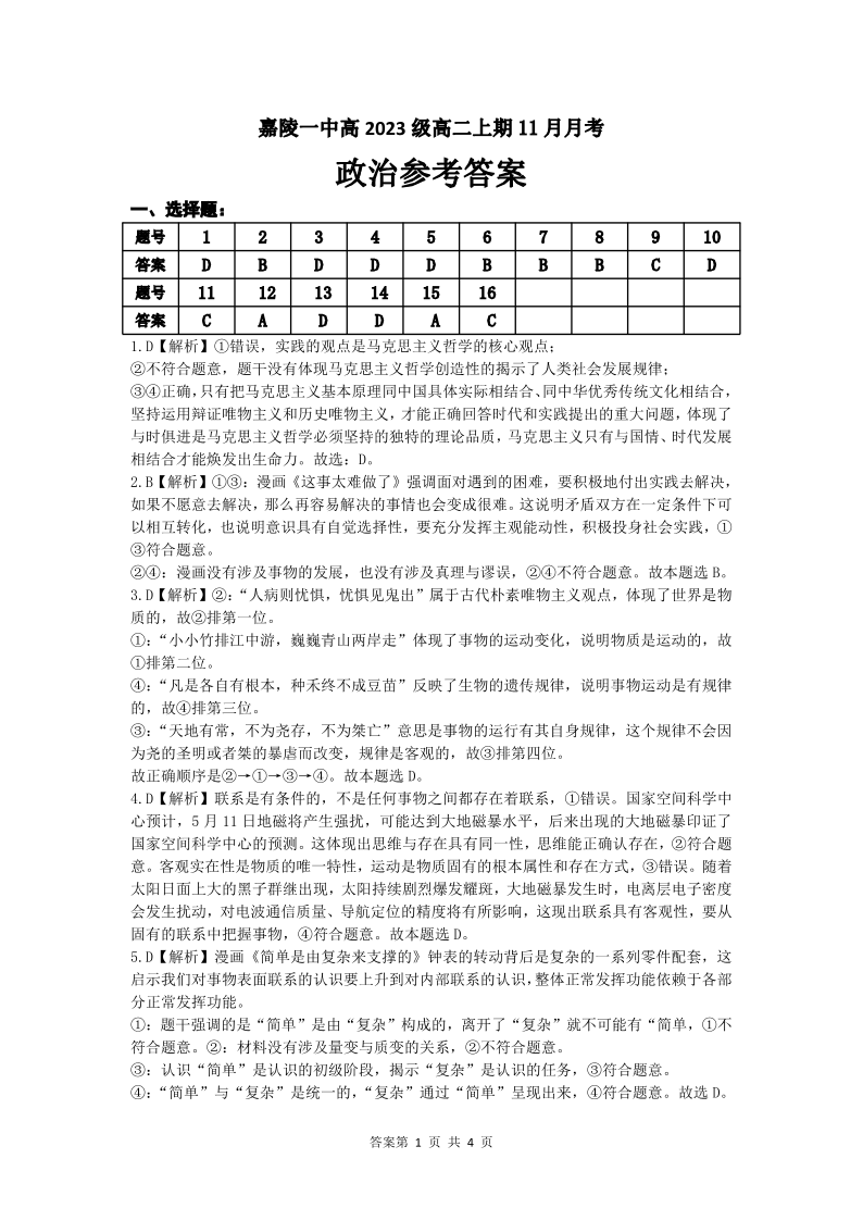 四川省南充市嘉陵一中2024-2025学年高二上学期第二次月考 政治答案