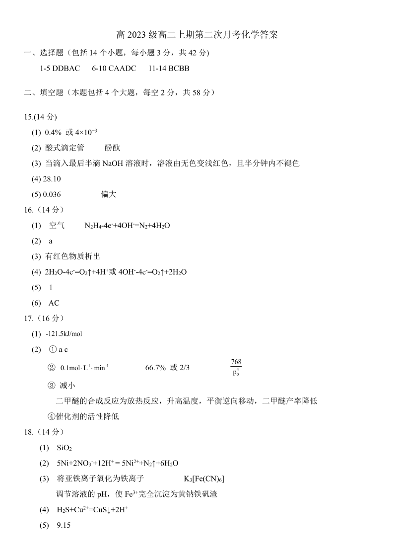 四川省南充市嘉陵一中2024-2025学年高二上学期第二次月考 化学答案