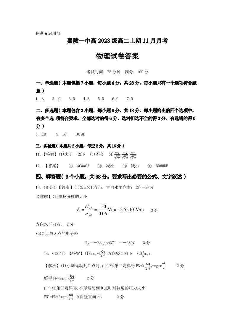 四川省南充市嘉陵一中2024-2025学年高二上学期第二次月考 物理答案