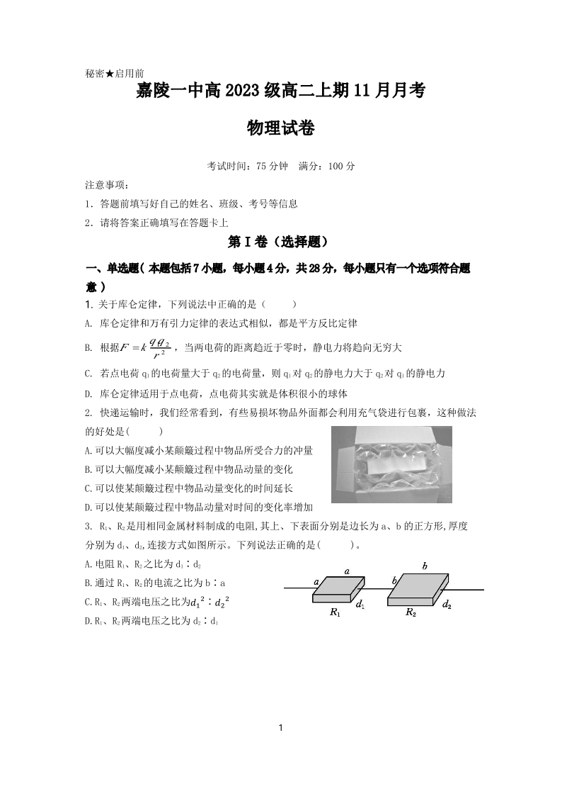 四川省南充市嘉陵一中2024-2025学年高二上学期第二次月考 物理