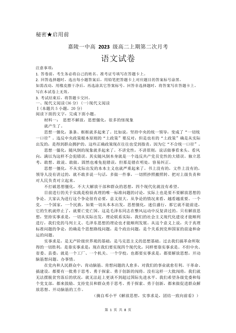 四川省南充市嘉陵一中2024-2025学年高二上学期第二次月考 语文