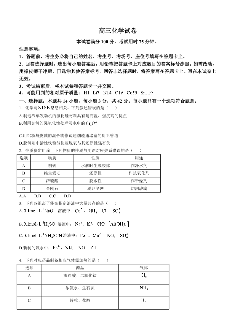 陕西省部分学校2025届高三上学期11月期中考试 化学