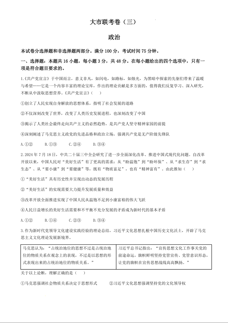 陕西省汉中市2025届高三上学期联考(三)(11月期中)政治