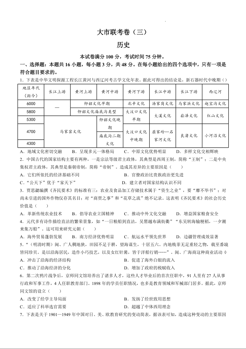 陕西省汉中市2025届高三上学期联考(三)(11月期中)历史