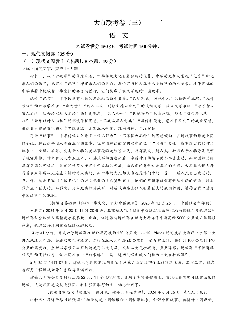 陕西省汉中市2025届高三上学期联考(三)(11月期中)语文