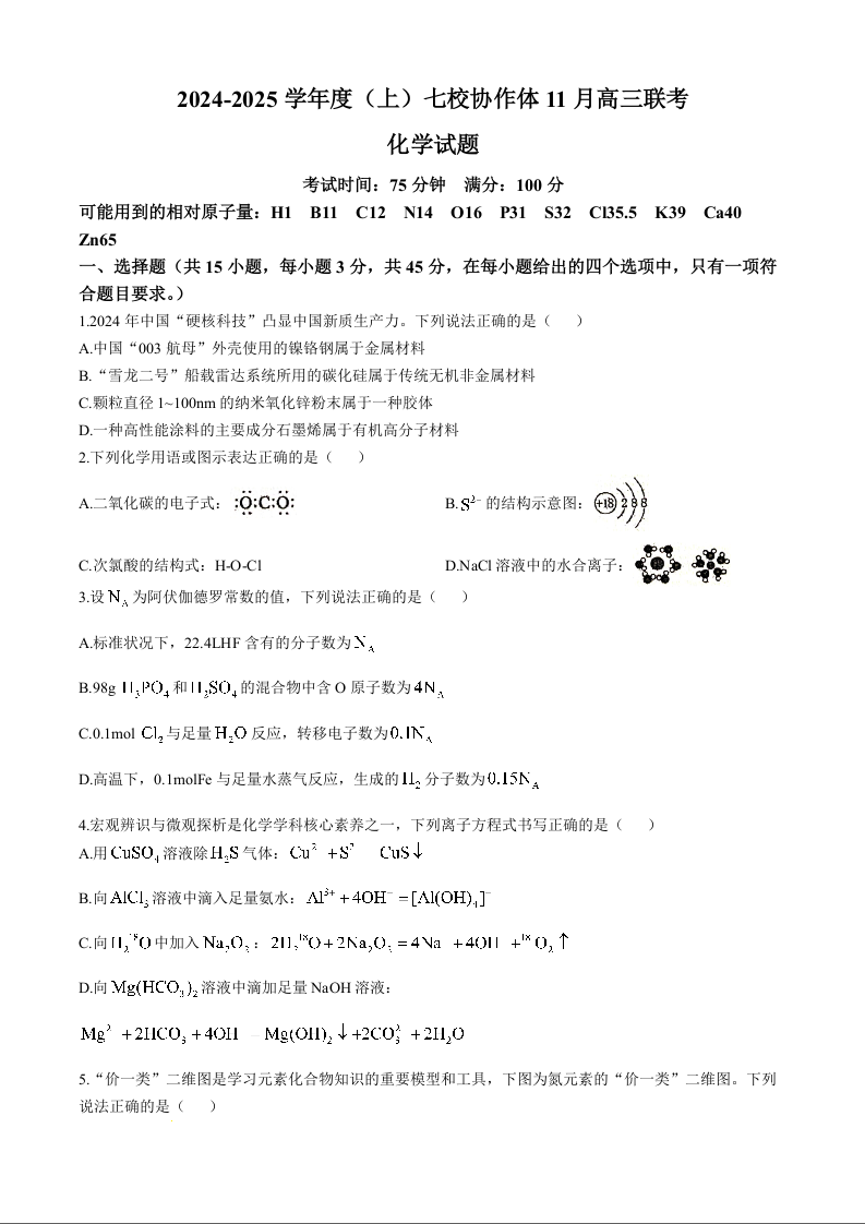 辽宁省七校协作体2024-2025学年高三上学期11月期中联考 化学