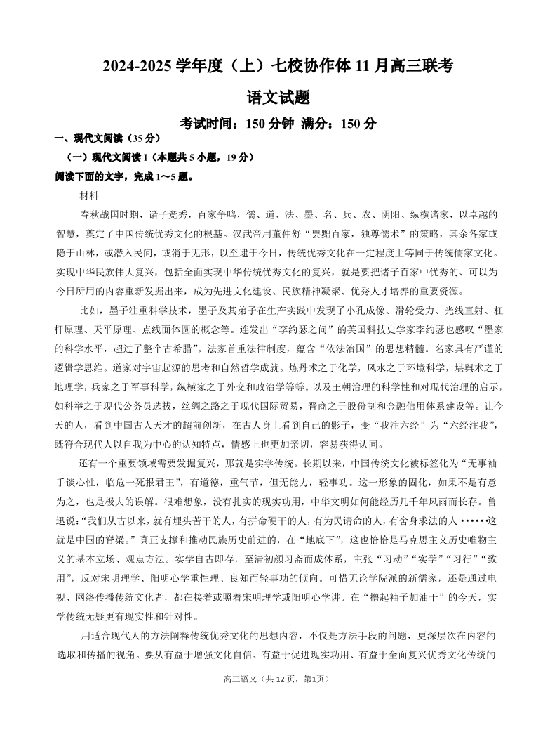 辽宁省七校协作体2024-2025学年高三上学期11月期中联考 语文