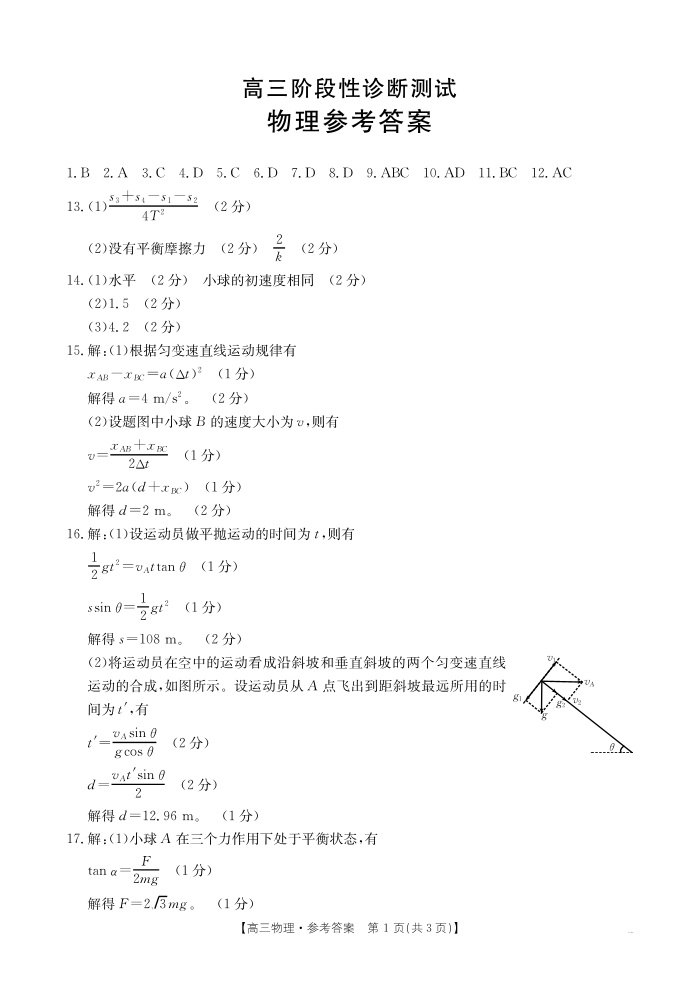 河南省部分学校2024-2025学年高三11月阶段性诊断考试 物理答案