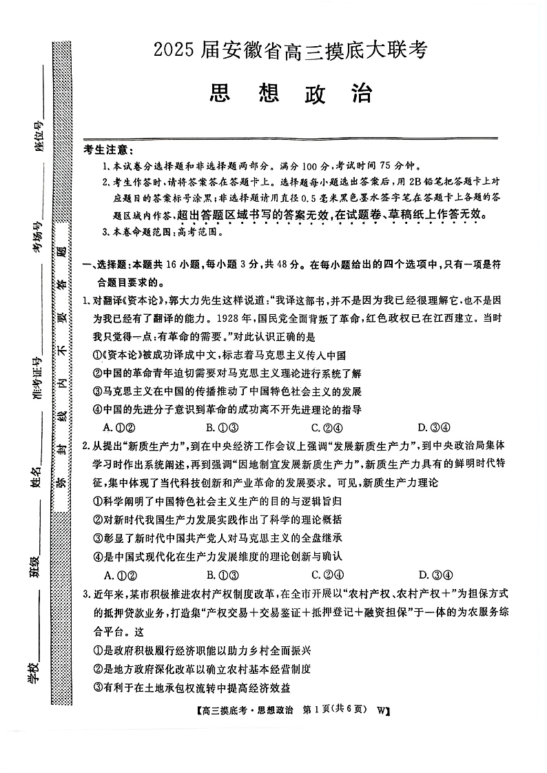 安徽皖江名校联盟2025届高三11月摸底大联考 政治