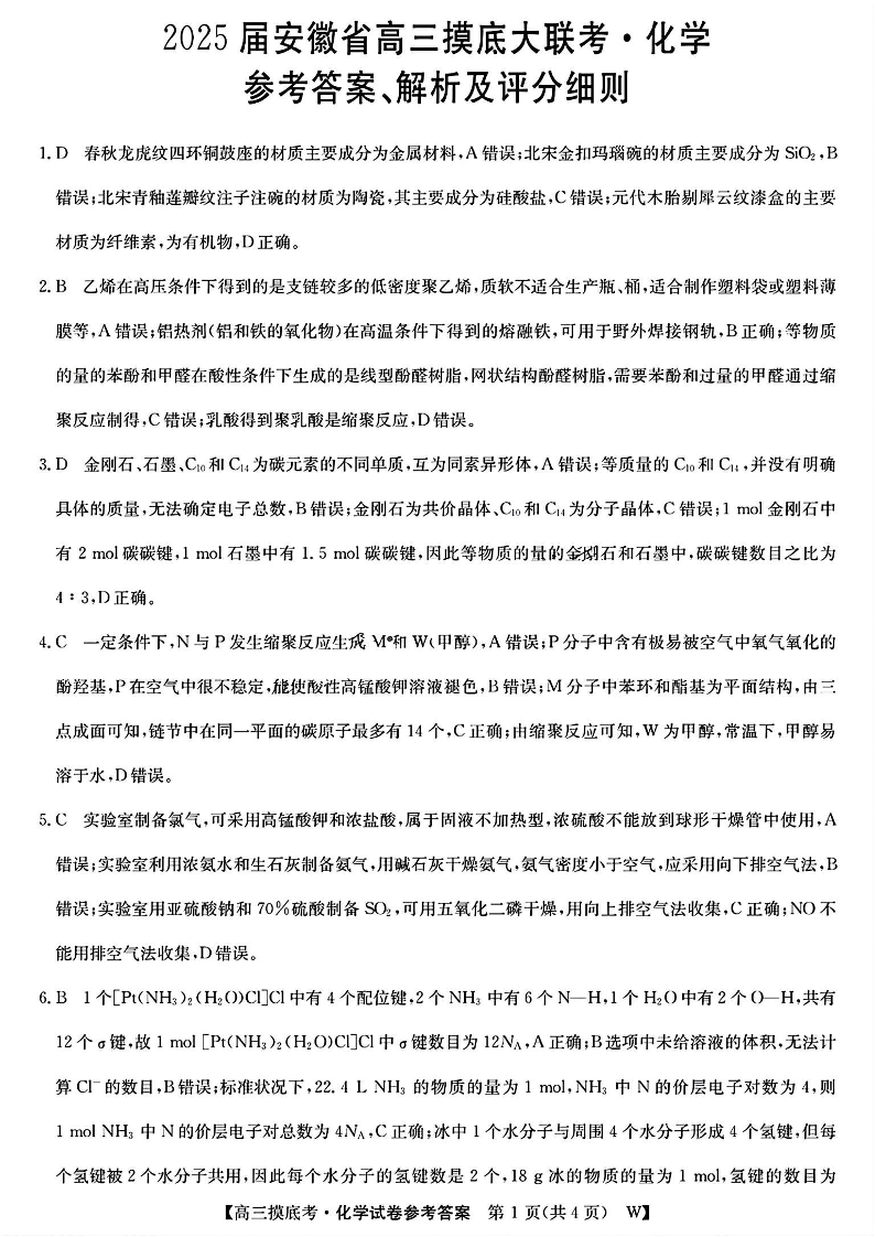 安徽皖江名校联盟2025届高三11月摸底大联考 化学答案