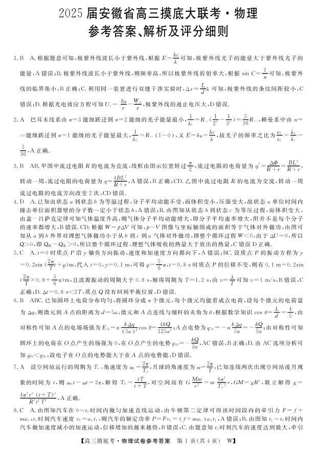 安徽皖江名校联盟2025届高三11月摸底大联考 物理答案