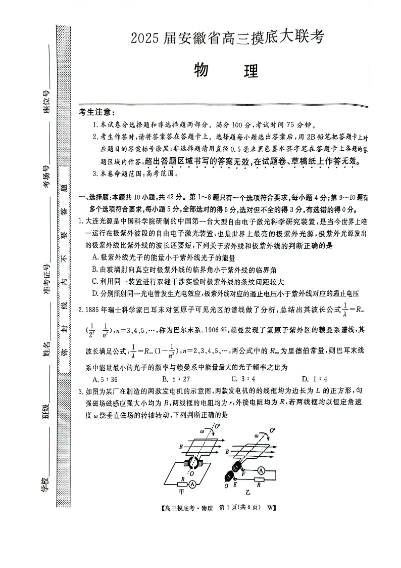 安徽皖江名校联盟2025届高三11月摸底大联考 物理