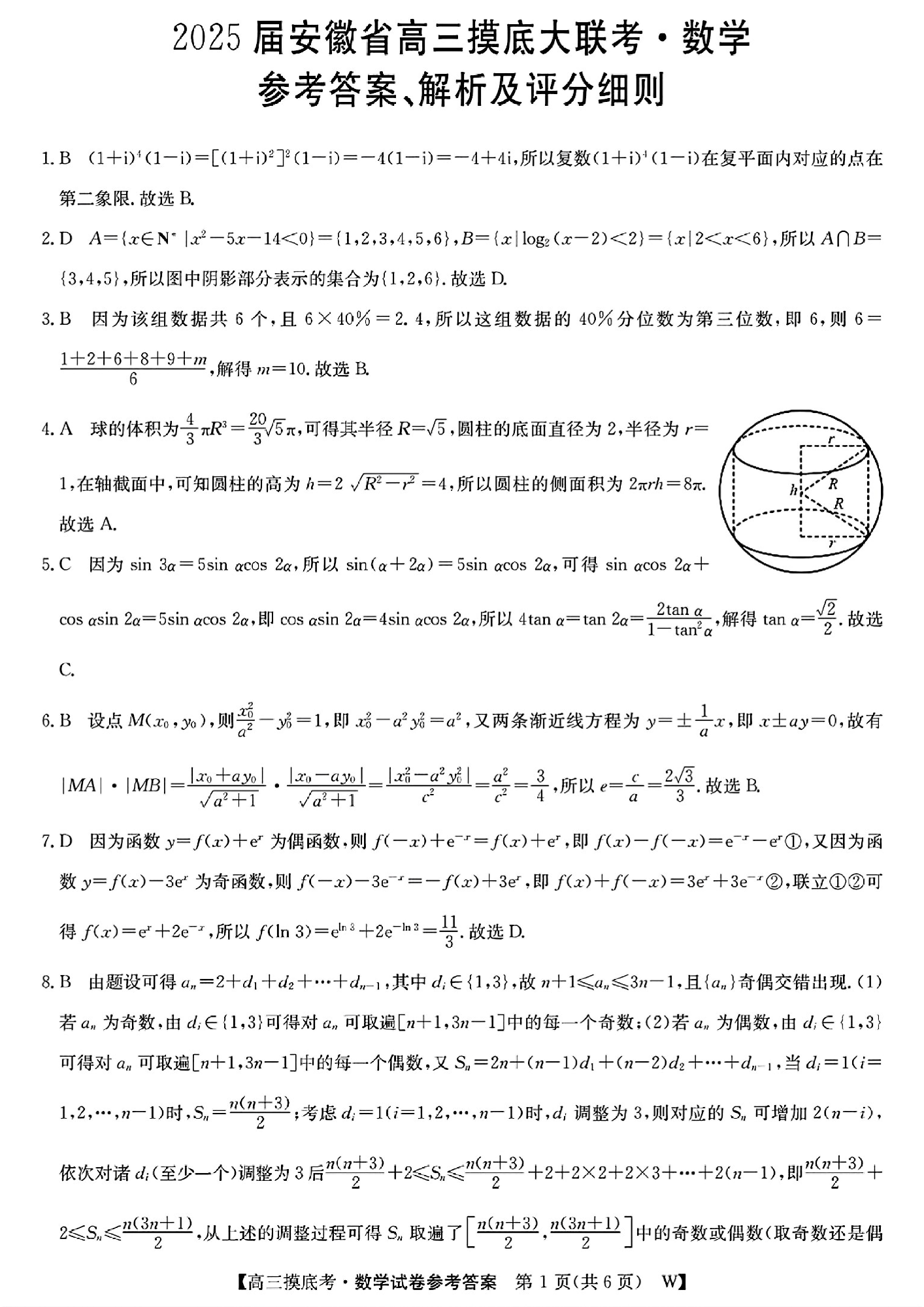 安徽皖江名校联盟2025届高三11月摸底大联考 数学答案