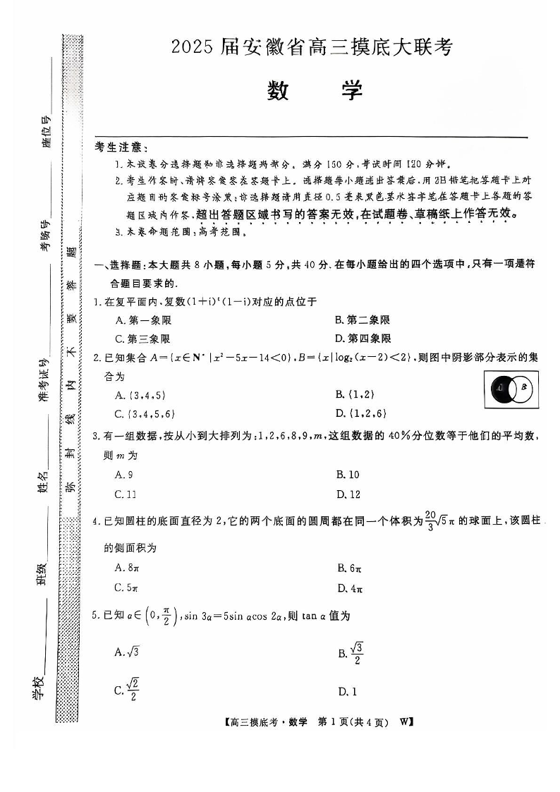 安徽皖江名校联盟2025届高三11月摸底大联考 数学