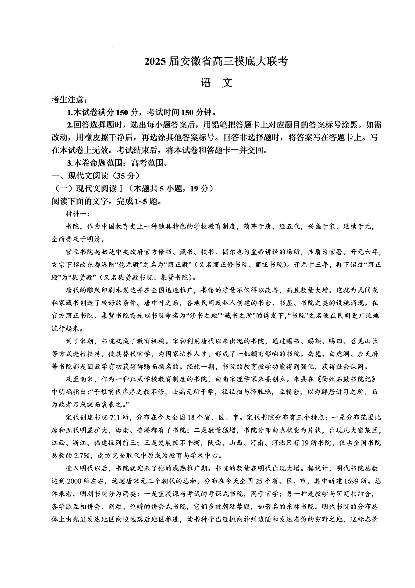 安徽皖江名校联盟2025届高三11月摸底大联考 语文