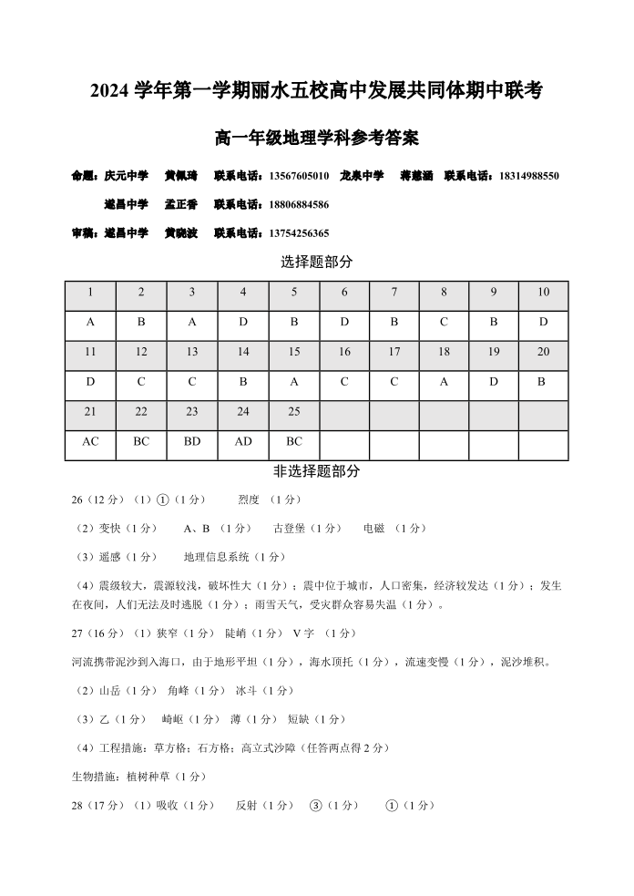 2024学年第一学期丽水五校高中发展共同体高一年级期中联考 地理答案