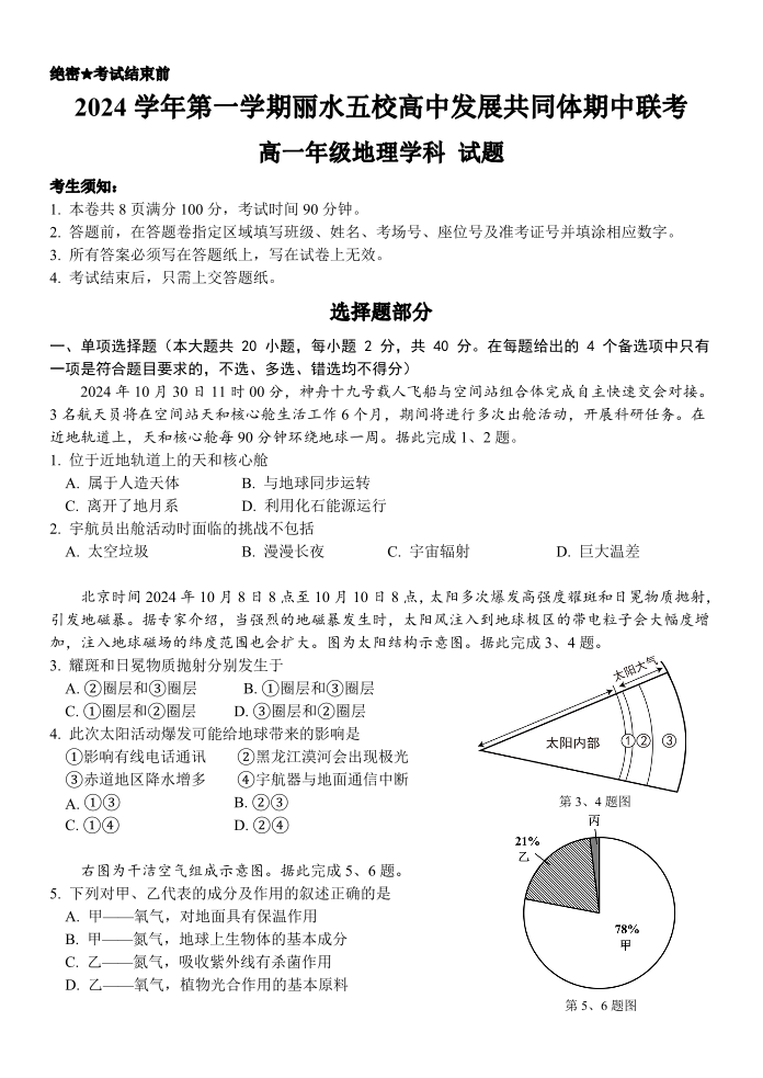 2024学年第一学期丽水五校高中发展共同体高一年级期中联考 地理