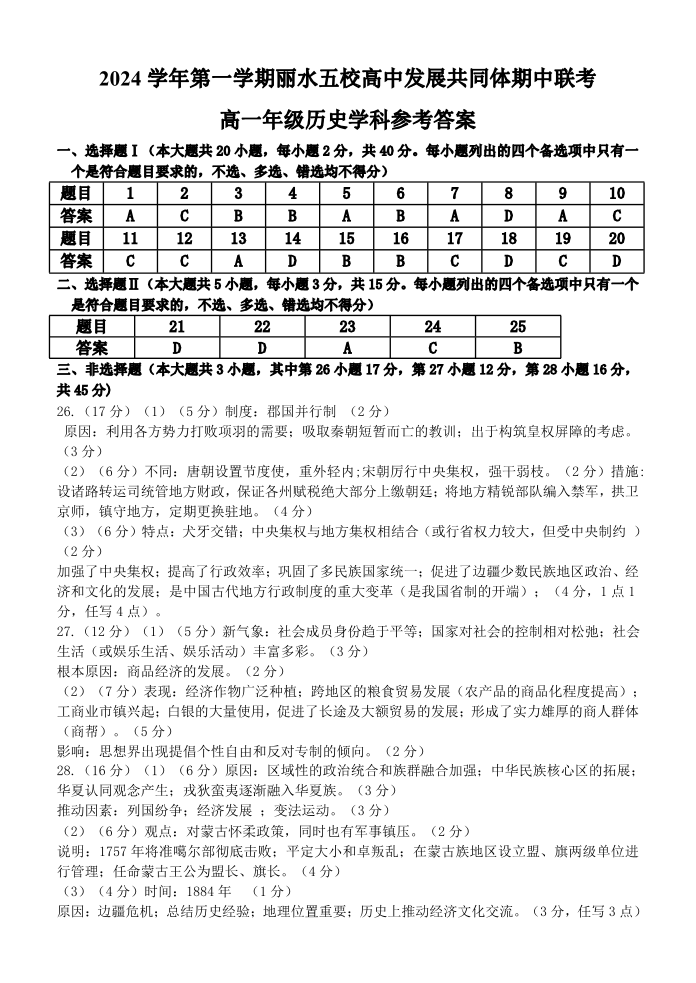 2024学年第一学期丽水五校高中发展共同体高一年级期中联考 历史答案