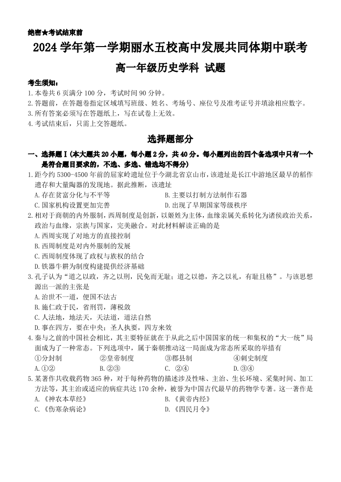2024学年第一学期丽水五校高中发展共同体高一年级期中联考 历史