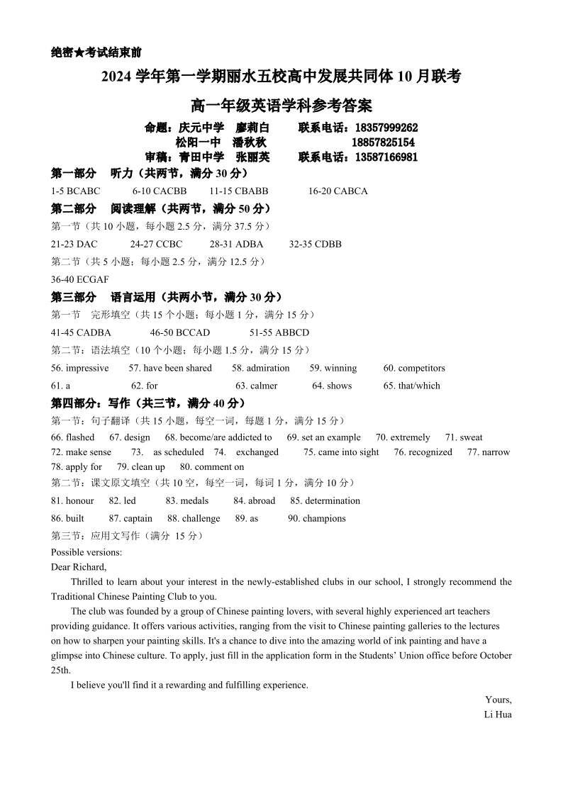 2024学年第一学期丽水五校高中发展共同体高一年级期中联考 英语答案