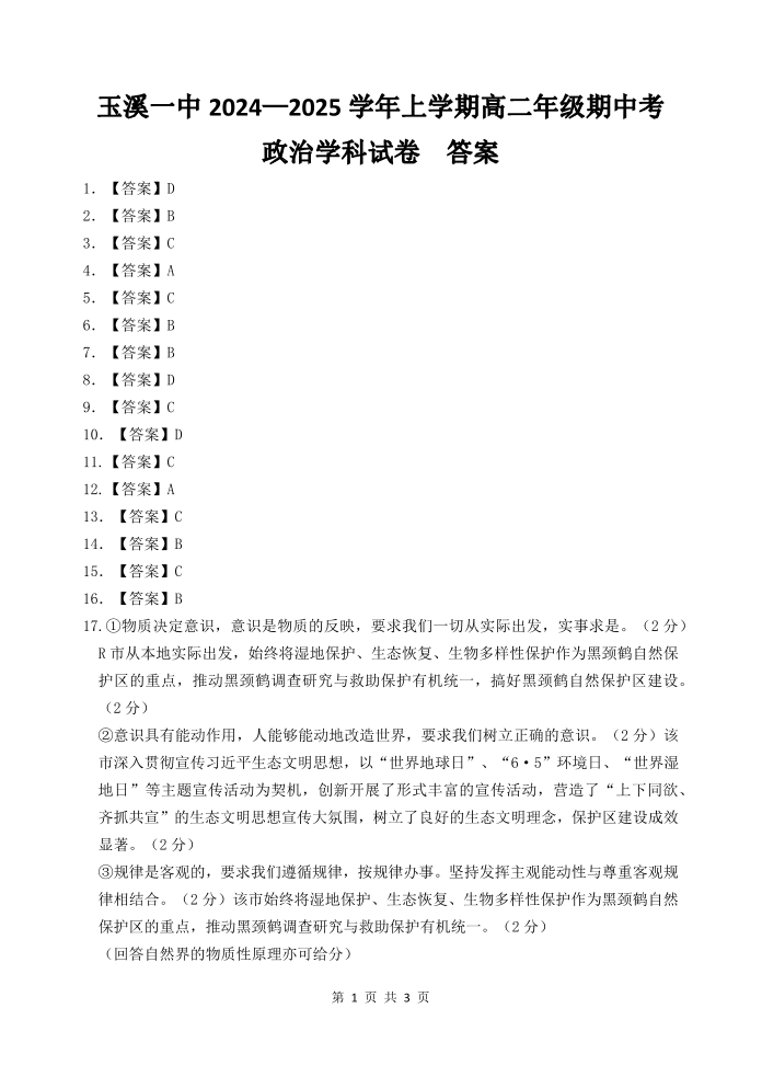 云南省玉溪市一中2024-2025学年高二上学期期中考试 政治答案