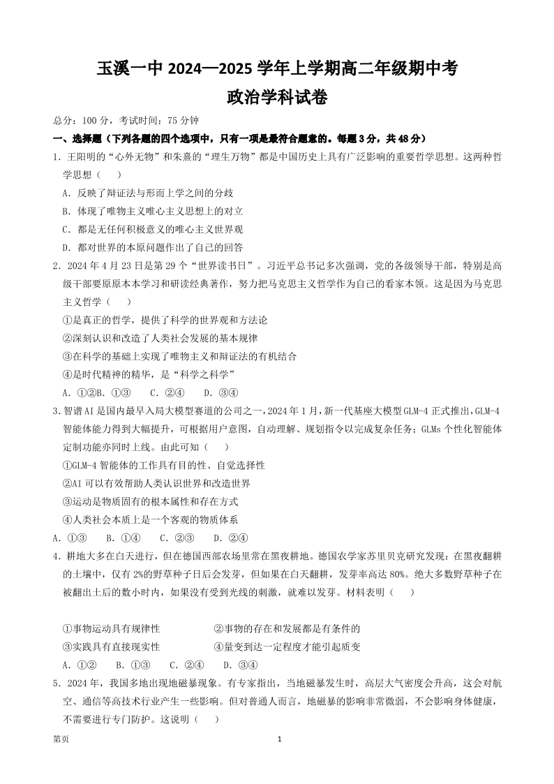 云南省玉溪市一中2024-2025学年高二上学期期中考试 政治