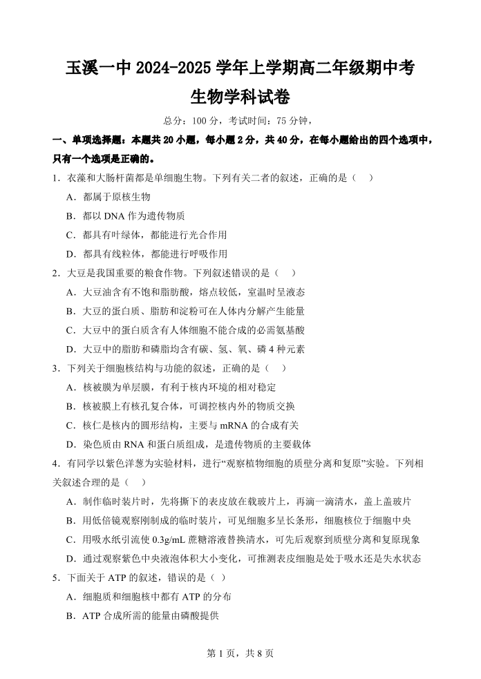 云南省玉溪市一中2024-2025学年高二上学期期中考试 生物