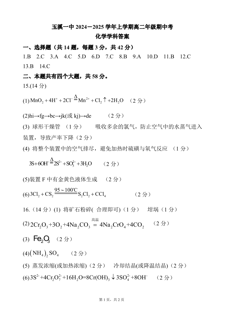 云南省玉溪市一中2024-2025学年高二上学期期中考试 化学答案