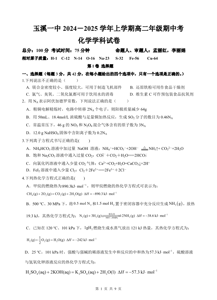 云南省玉溪市一中2024-2025学年高二上学期期中考试 化学