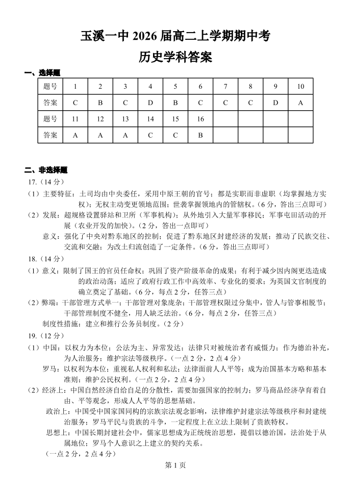 云南省玉溪市一中2024-2025学年高二上学期期中考试 历史答案