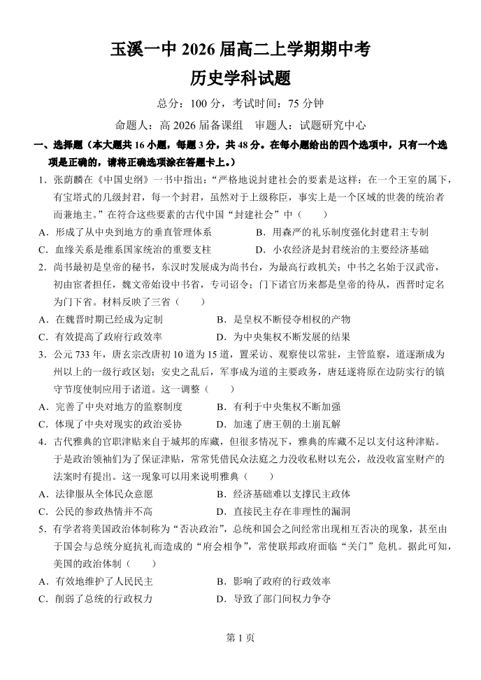 云南省玉溪市一中2024-2025学年高二上学期期中考试 历史