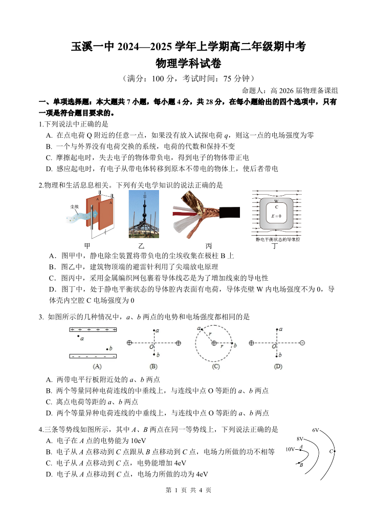 云南省玉溪市一中2024-2025学年高二上学期期中考试 物理