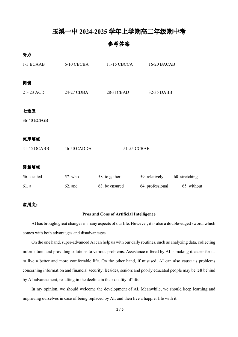 云南省玉溪市一中2024-2025学年高二上学期期中考试 英语答案