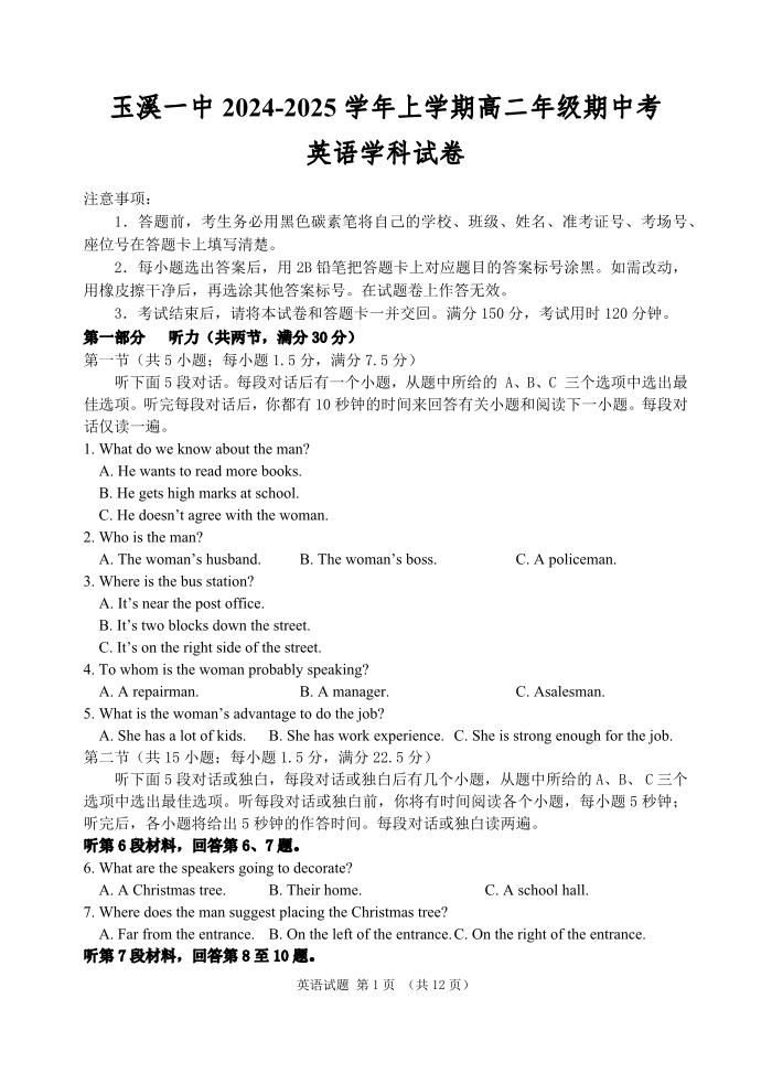 云南省玉溪市一中2024-2025学年高二上学期期中考试 英语