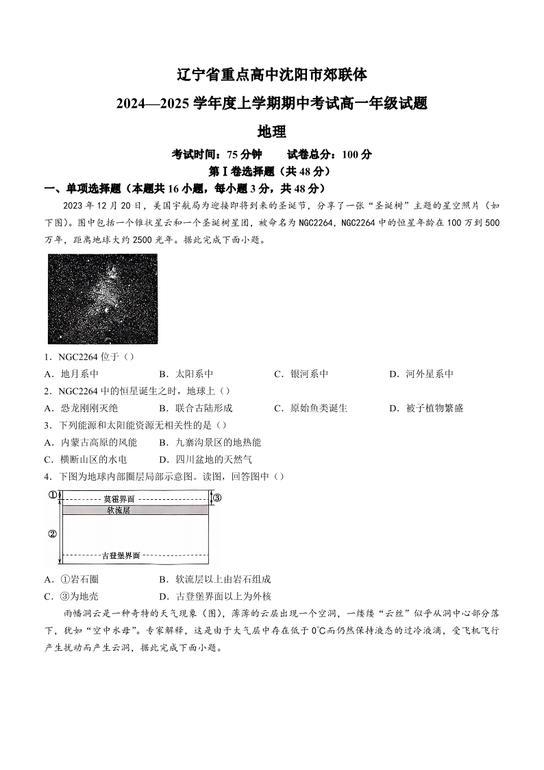 辽宁省沈阳市郊联体2024-2025学年高一上学期11月期中考试 地理