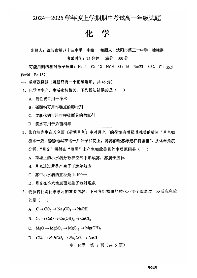 辽宁省沈阳市郊联体2024-2025学年高一上学期11月期中考试 化学