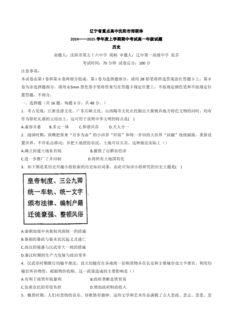 辽宁省沈阳市郊联体2024-2025学年高一上学期11月期中考试 历史