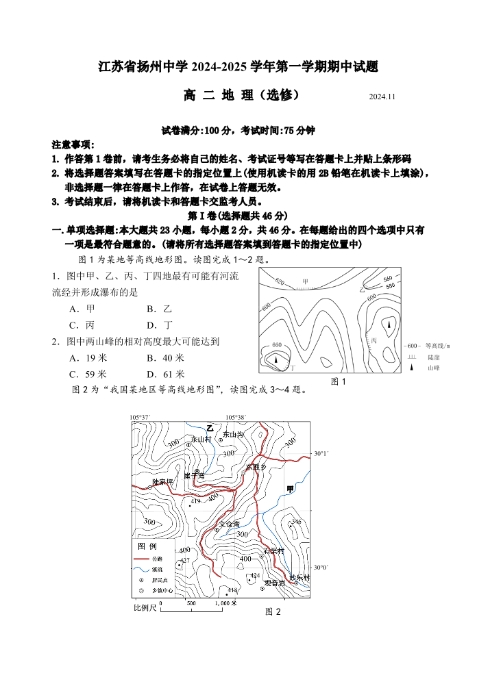 江苏省扬州中学2024-2025学年高二年级第一学期期中试卷 地理