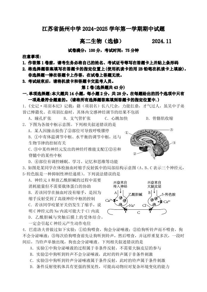 江苏省扬州中学2024-2025学年高二年级第一学期期中试卷 生物