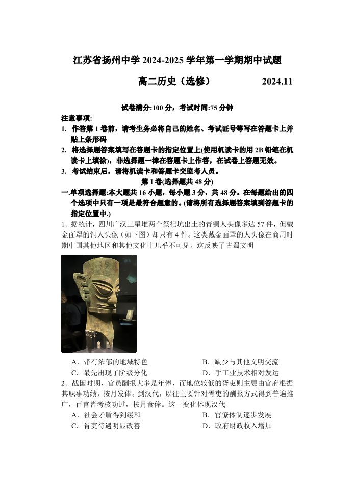 江苏省扬州中学2024-2025学年高二年级第一学期期中试卷 历史