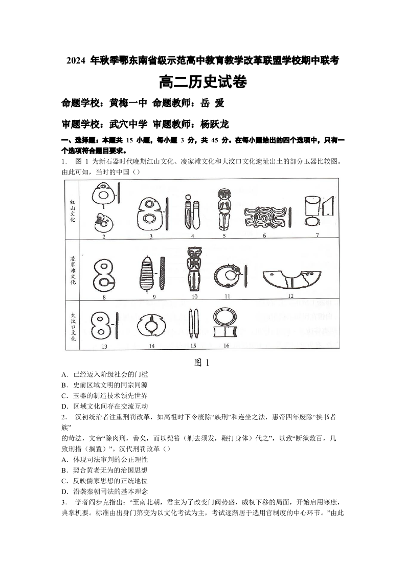 湖北省鄂东南联盟2024-2025学年高二上学期期中联考 历史