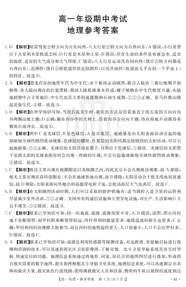 河北省定州市名校2024-2025学年高一上学期期中联考 地理答案
