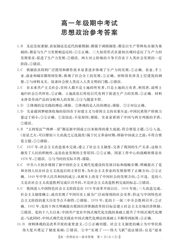 河北省定州市名校2024-2025学年高一上学期期中联考 政治答案