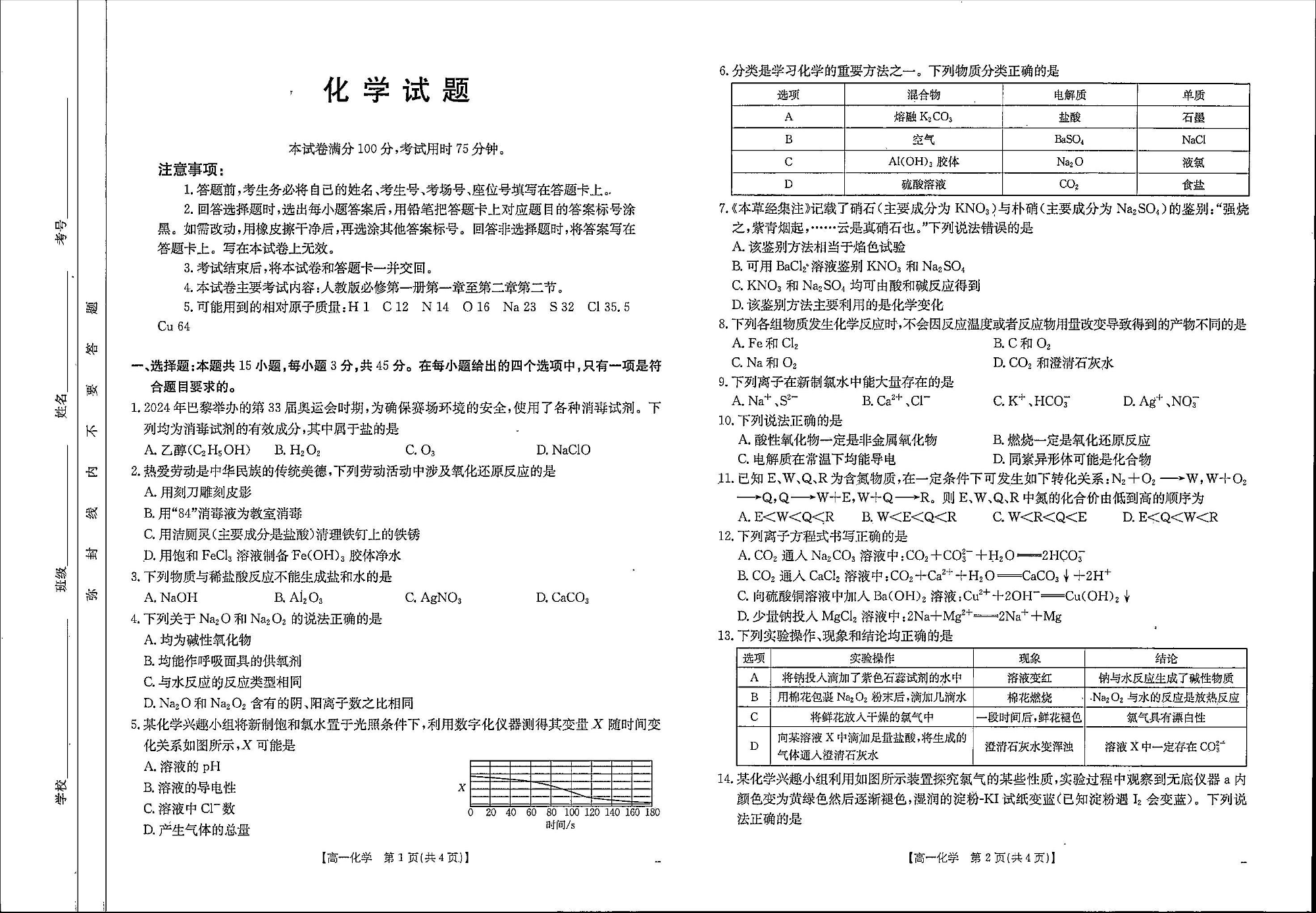 河北省定州市名校2024-2025学年高一上学期期中联考 化学