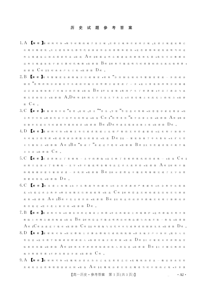 河北省定州市名校2024-2025学年高一上学期期中联考 历史答案