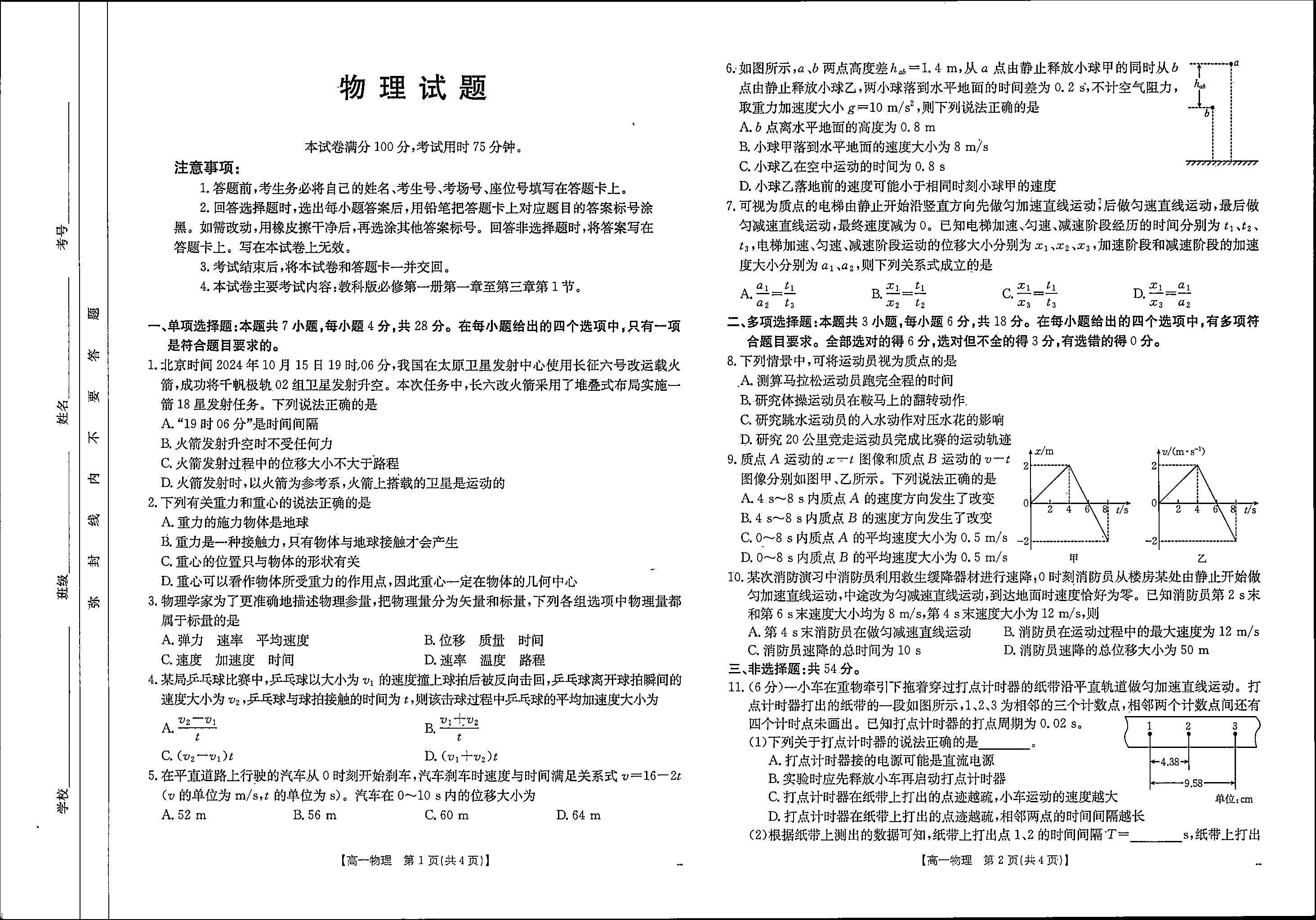 河北省定州市名校2024-2025学年高一上学期期中联考 物理