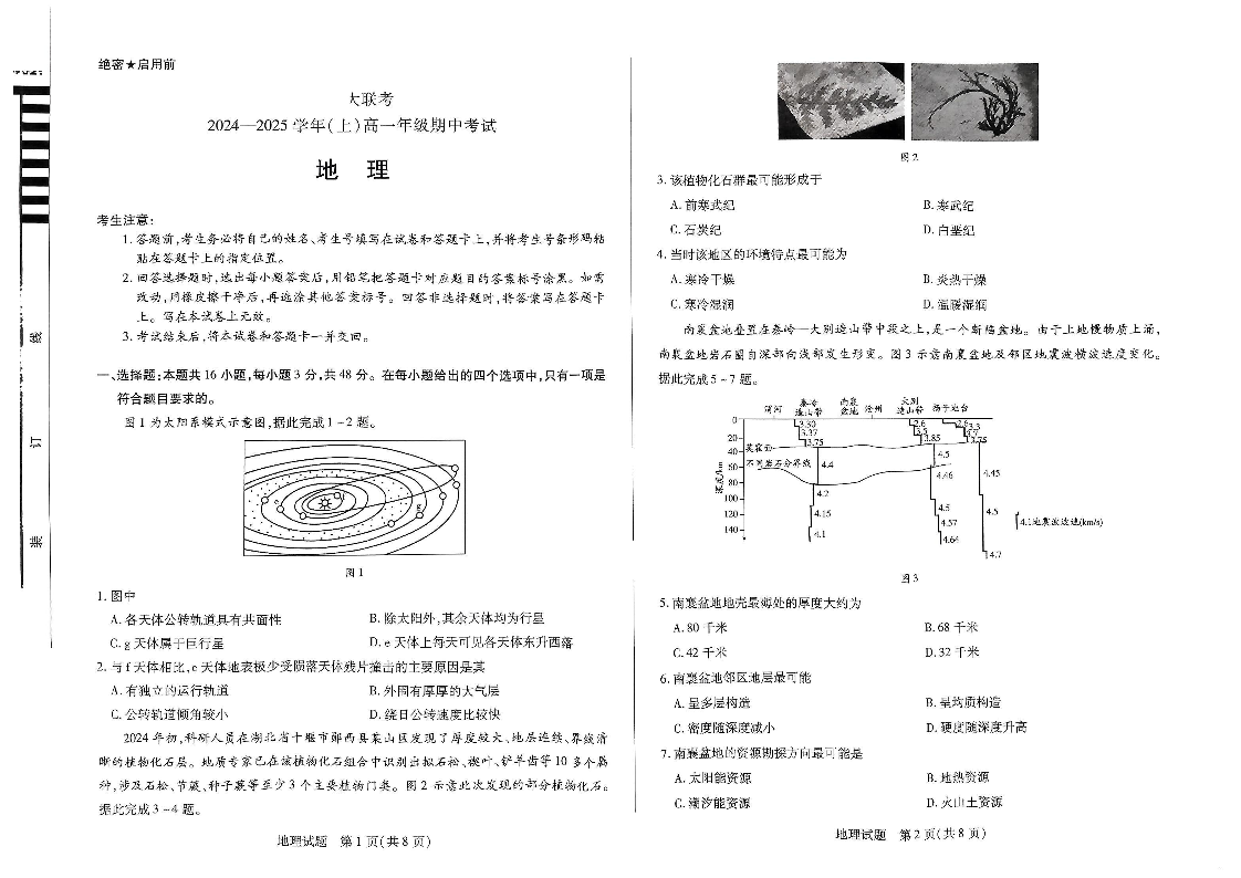 河南省部分学校2024-2025学年高一上学期11月期中联考 地理