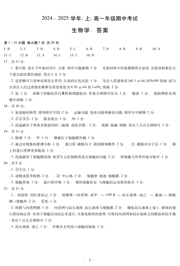 河南省部分学校2024-2025学年高一上学期11月期中联考 生物答案
